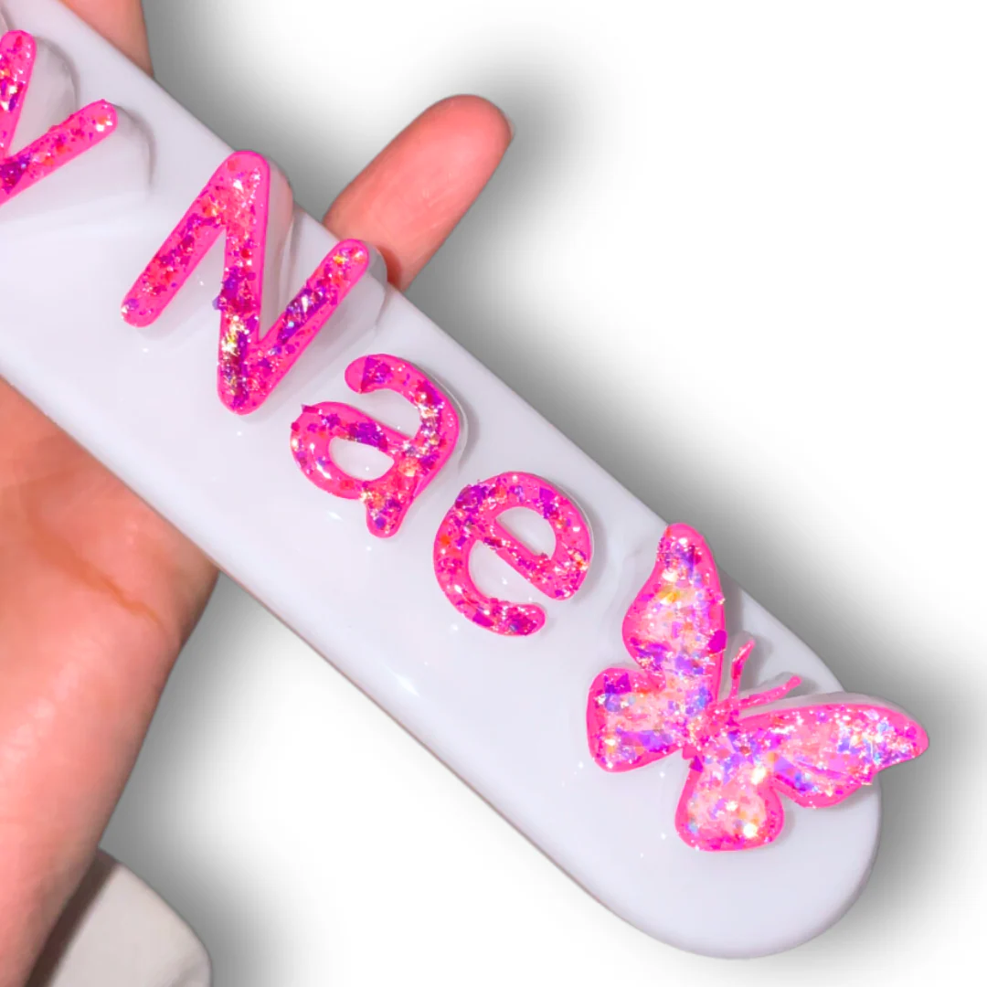 Angled White Nameplate with Arial font, hot pink letters, hot pink glitter and butterfly.